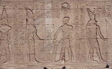 1) La déesse Seshat et le pharaon plantent les chevalets entre lesquels est tendu la corde qui délimitera le contour de l'édifice. La déesse Hathor et le dieu Horus assistent au rite.